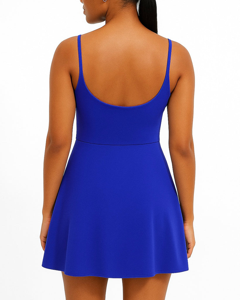 Meet Scottie! A classic active dress with a flattering scoop neckline, delicate spaghetti straps, and a flowy A-line skirt. This piece blends elegance with functionality. Hidden underneath, 2-inch built-in shorts provide comfort and coverage, making it perfect for everything from studio workouts to everyday errands.