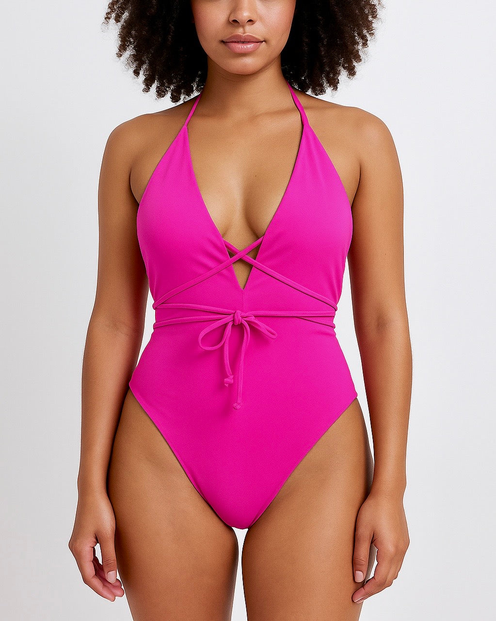 Meet Toni! A classic one piece with a deep V-neckline, a little side boob, low scoop back, long waist ties and full back coverage.