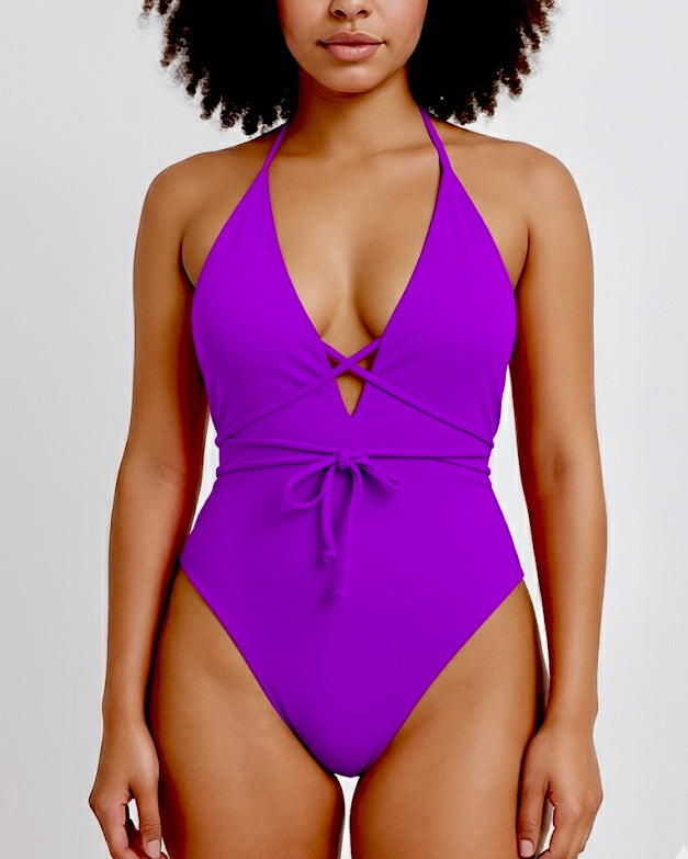 Meet Toni! A classic one piece with a deep V-neckline, a little side boob, low scoop back, long waist ties and full back coverage.